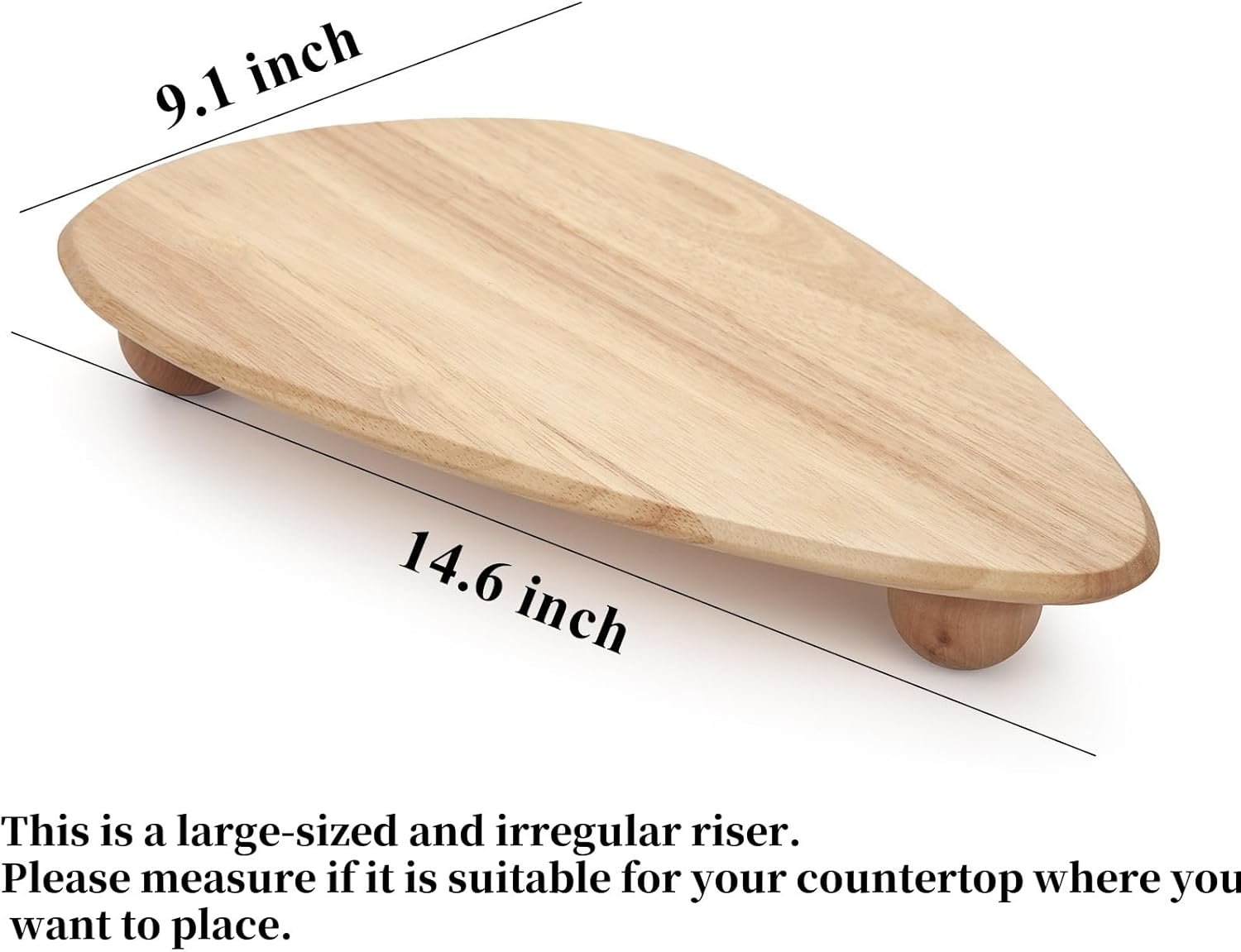 - Suitable Size: The wood pedestal riser: 14.6 x 9.1 x 2.2 inch, the thickness of the board is 0.4 inch, the diameter of the spherical base is 1.8 inch, suitable size to hold or show your items. This is a large size of Irregular wood riser, please measure if it is suitable for your countertop where you want to place.