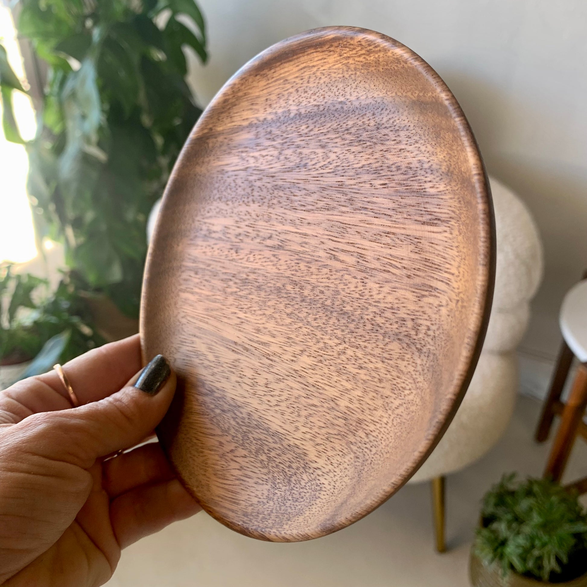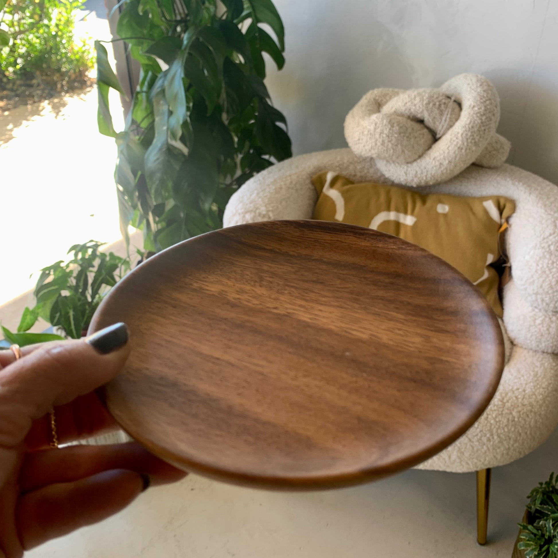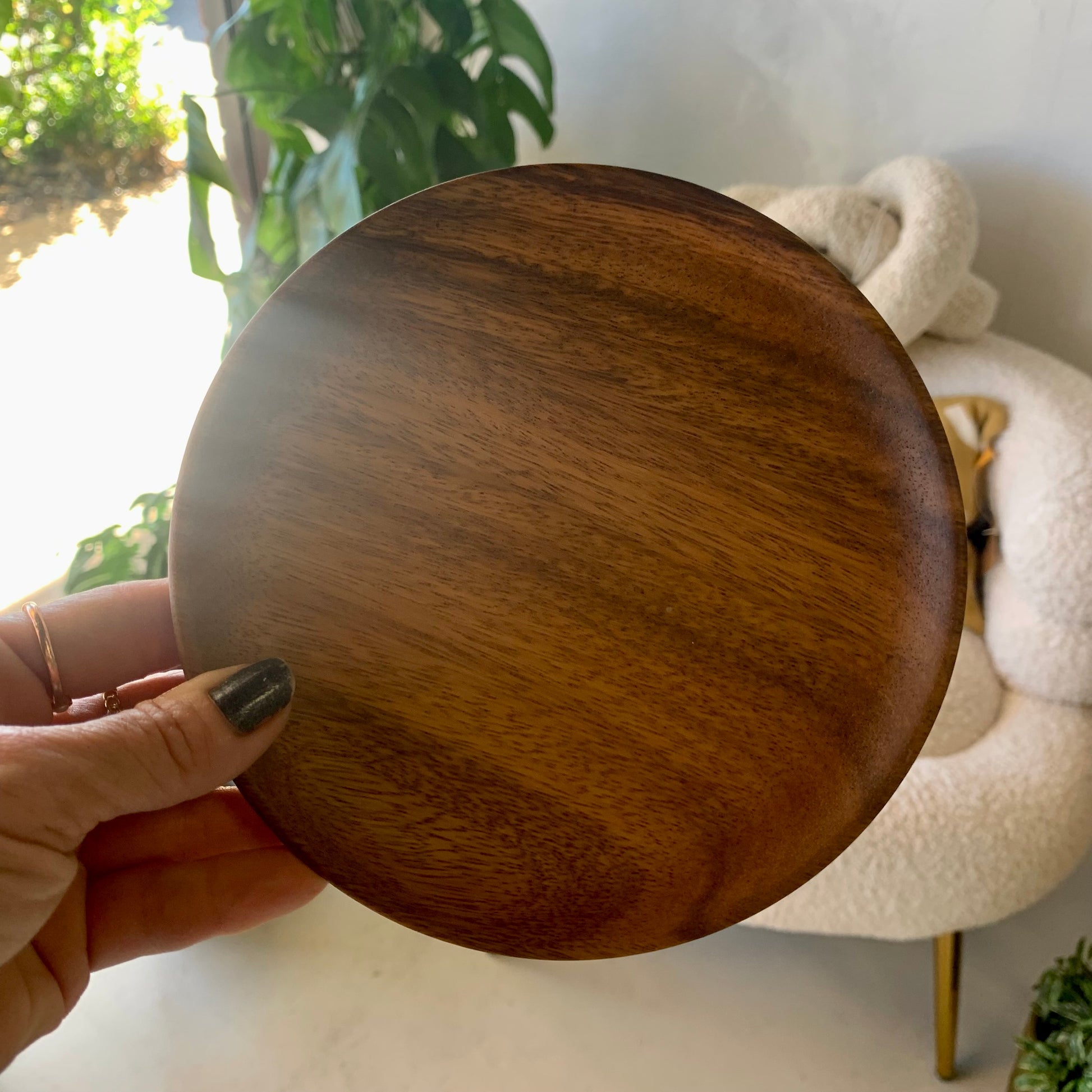Wooden round 6" diameter display tray, use as a catch all by the front door for keys, etc or place under you plants for protection or a stylish display.