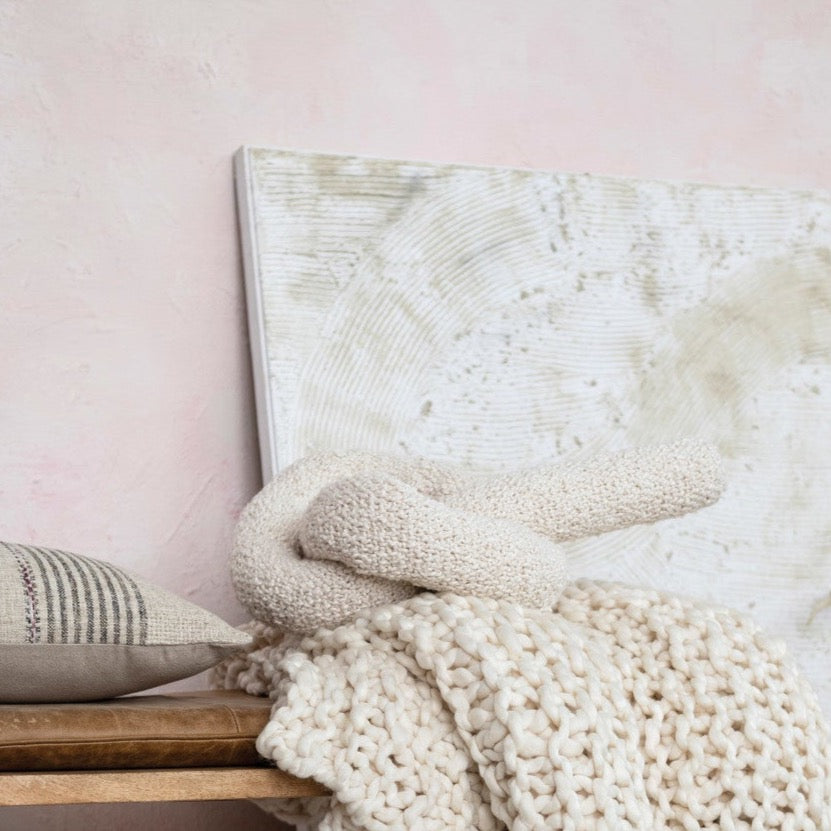 22"L x 9"W x 7"H Woven Cotton Bouclé Knot Pillow, Cream Color