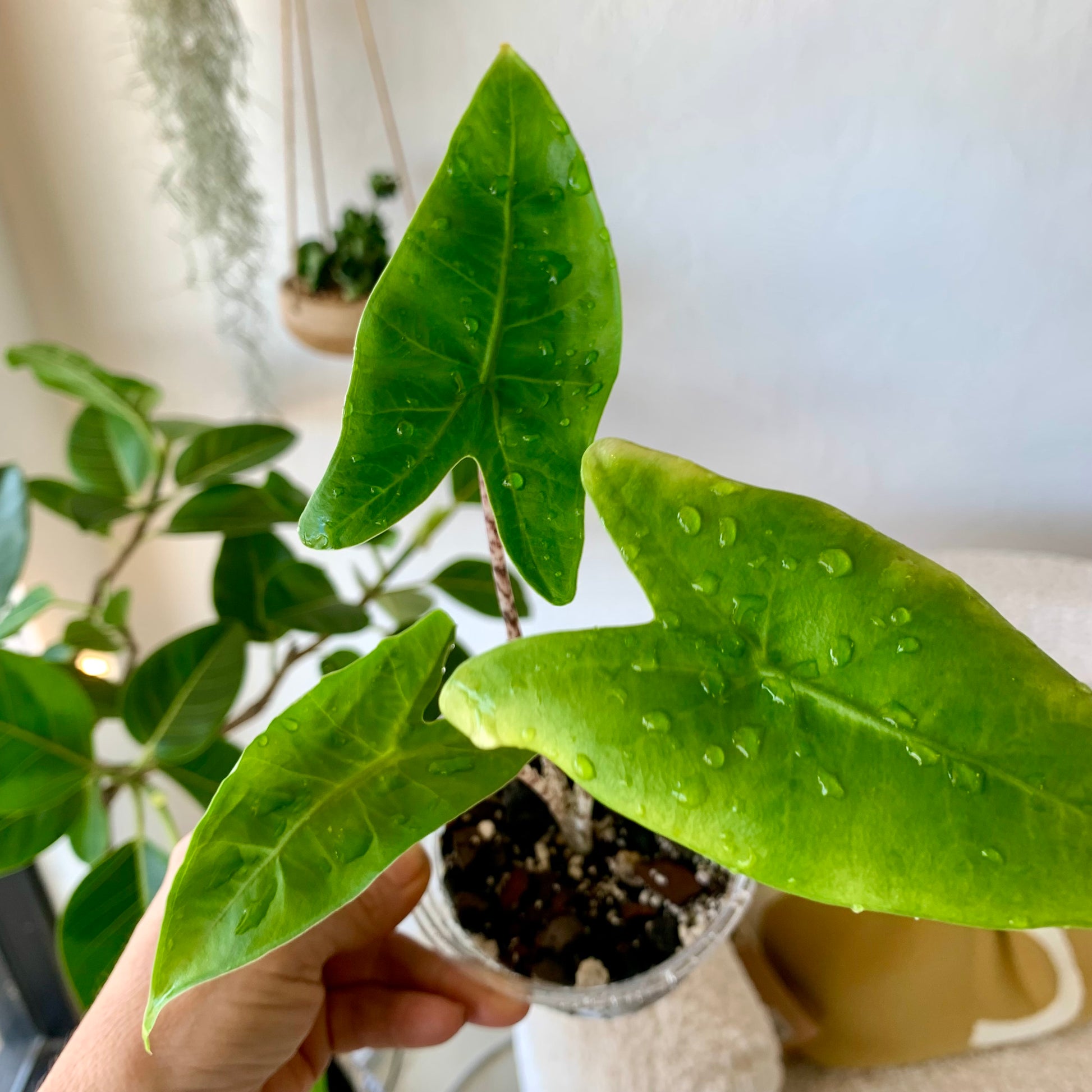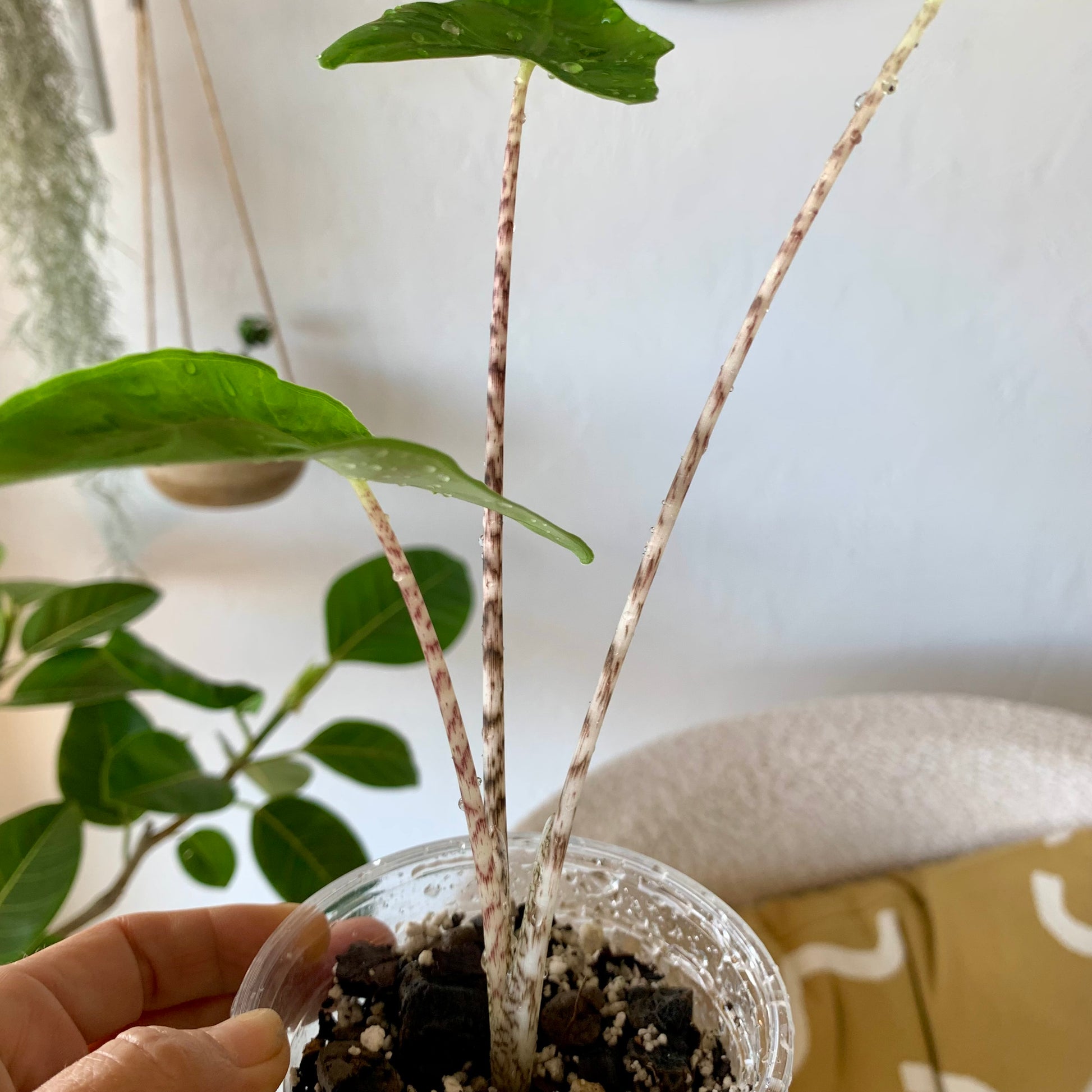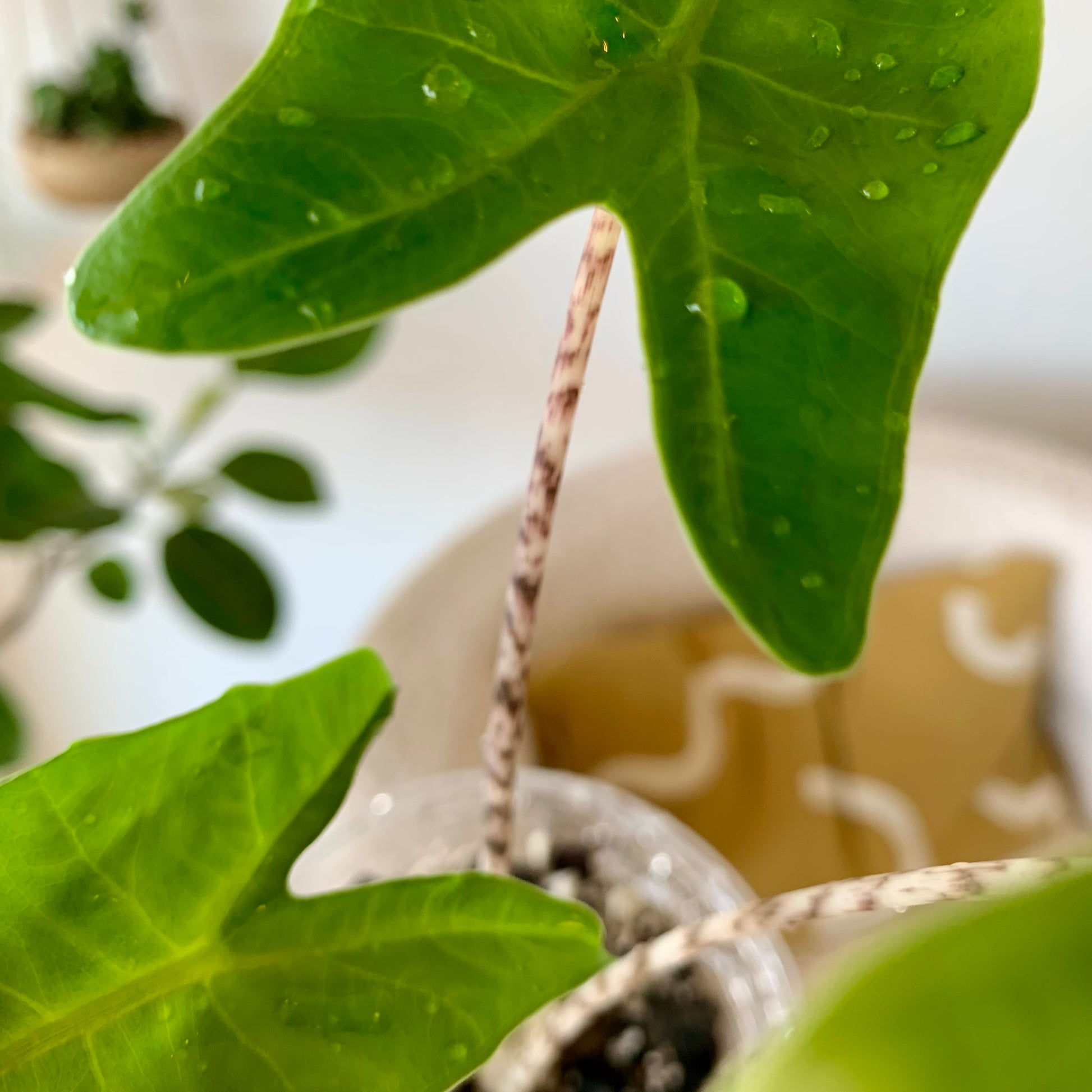 Alocasia zebrina, sometimes called a zebra plant, is a tropical houseplant prized for its zebra-like stems. The Alocasia zebrina is difficult to find and tricky to grow since it is known for being picky about its growing conditions. Native to the rainforests of the Philippines, this plant requires similar conditions—moist, well-draining soil, dappled sunlight, warm temperatures, humidity, and soil enriched with compost or fertilizer. Alocasia is toxic to humans and pets.