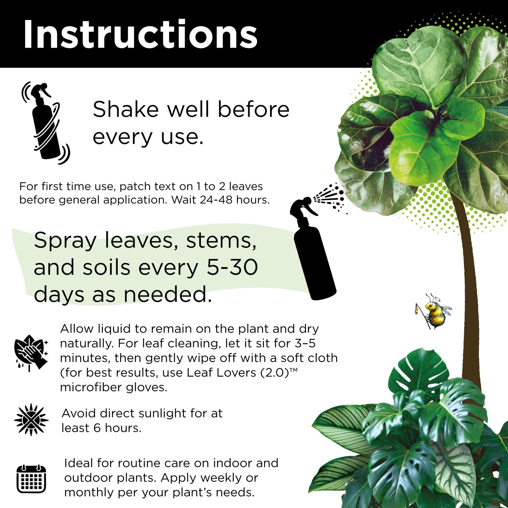- FOR SMART PLANT PARENTS : Use every 5-30 days as needed for plant care. Spray tops and bottoms of leaves, drench soil and roots for systemic plant health. Allow liquid to stay on leaves, or wait 3-5 minutes before gently wiping off, revealing a natural and healthy shine.
