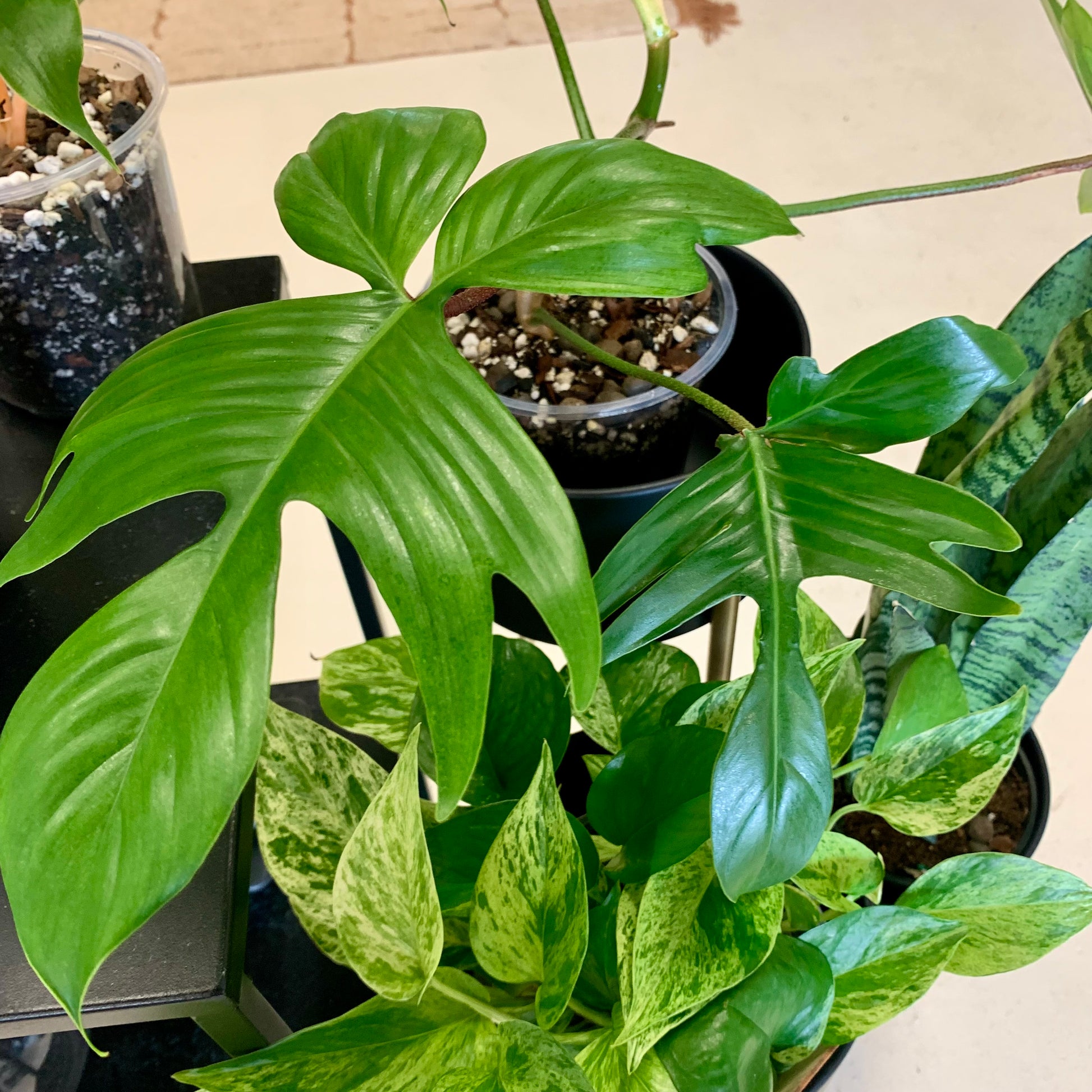 This rare tropical plant is known for its shiny, deeply lobed leaves on hairy red petioles that unfurl ghostly white before eventually darkening to a deep, attractive green. You'll sometimes see variegated versions of this plant, with green patterning against the white on immature leaves.