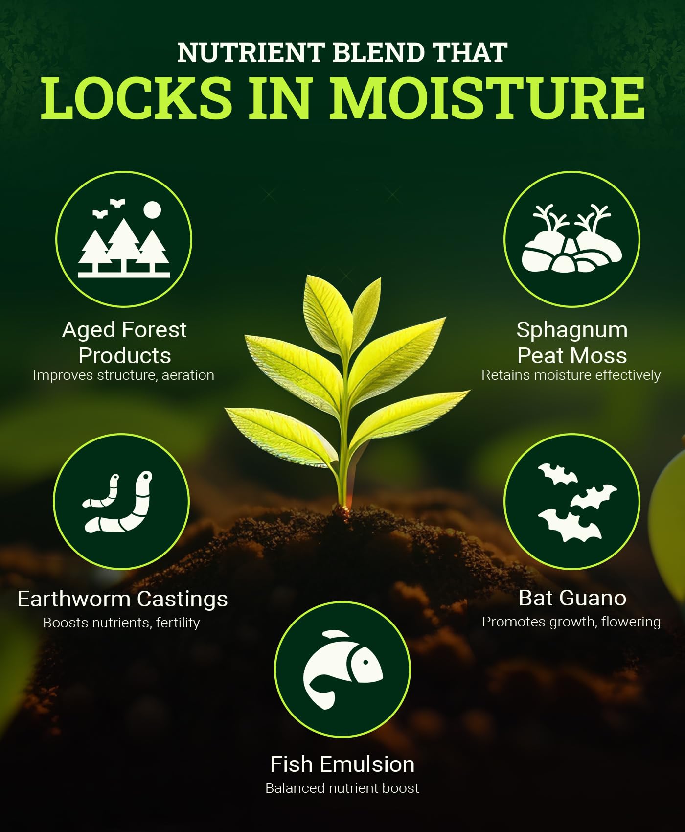 - MOISTURE-LOCKING NUTRIENT BLEND: This organic potting soil for plant is packed with aged forest products, sphagnum peat moss, earthworm castings, bat guano, and fish emulsion, each ingredient enhances moisture retention and nutrient uptake