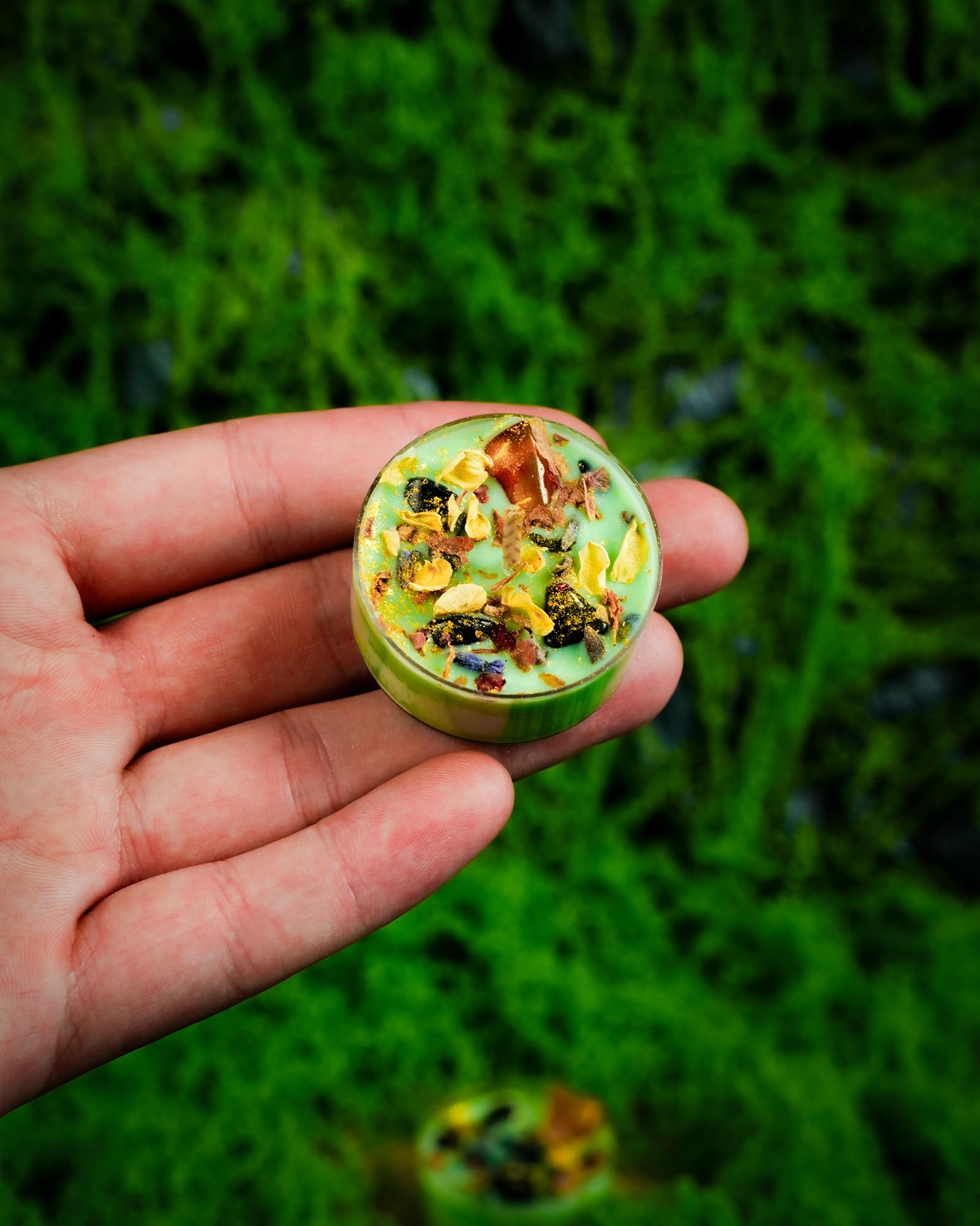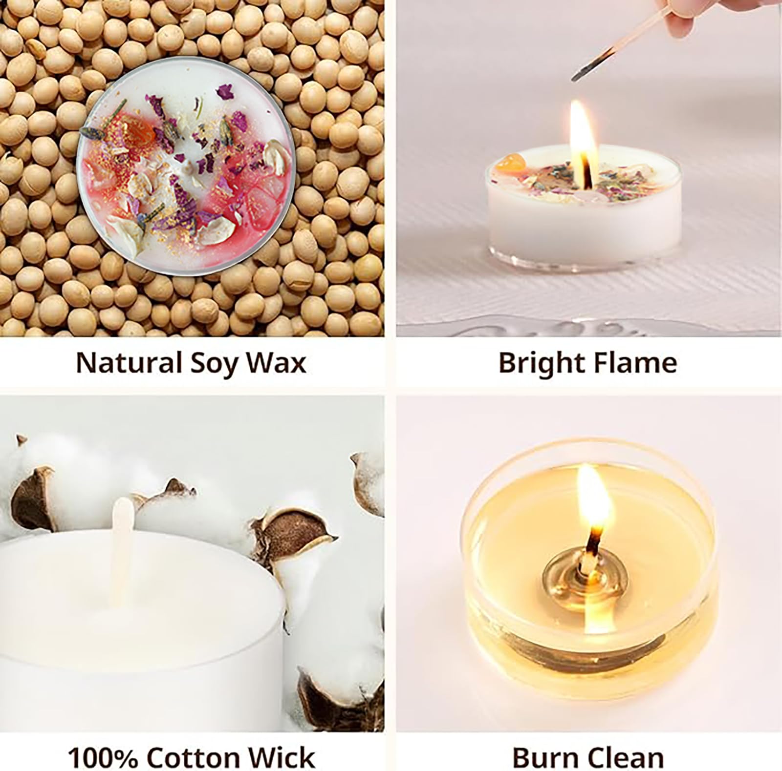- Each tealight is 0.75 inches tall, 1.5 inches in diameter and has a burn time of 3 to 5 hours (per tealight). Natural ecological soy wax, 100% cotton wicks (lead free!) , natural scents, organic herbs and flowers.